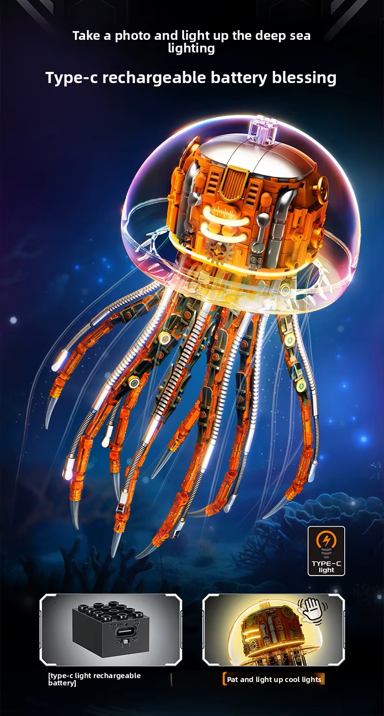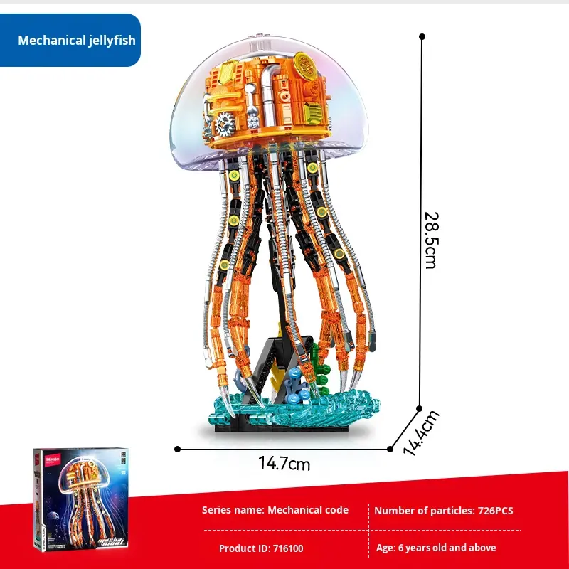 Mechanical Jellyfish Building Block Set with Lighting, 726 Pieces, Model with Display Stand, 28.5cm Ht
