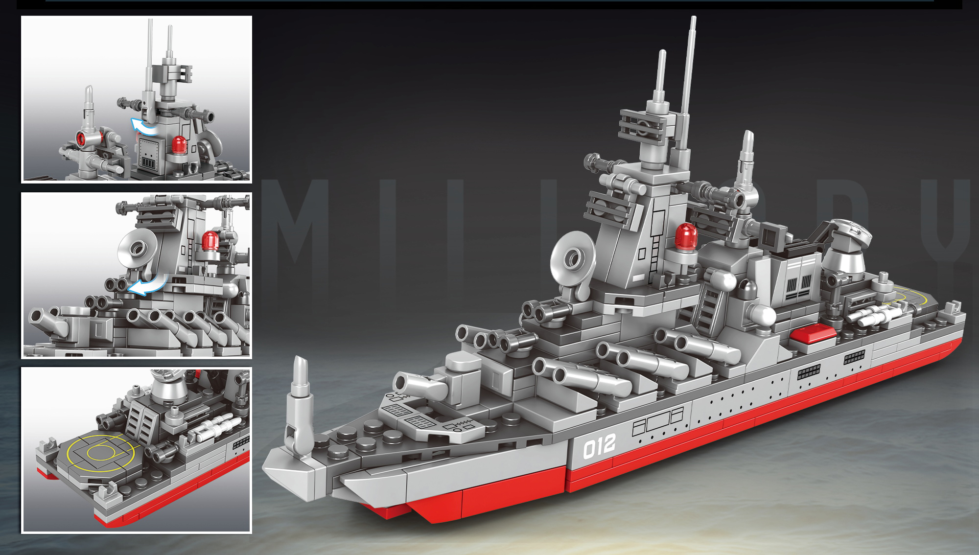 - REALISTIC FEATURES: Features multiple deck levels, helipad with markings, detailed superstructure, rotating turrets, and authentic grey and red naval colour scheme with hull number 012